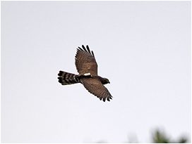 ハイタカ属のタカもよく渡りで観察されます。このグループにはオオタカ,ハイタカ,ツミ,アカハラダカが知られていますが,種間で模様が似ており,サイズも近いため,特に大きさの目安が少ない飛翔中の識別は難しく,上級者向けの観察対象です。また渡りのルートも詳しくわかっていないものが多いのですが,アカハラダカは繁殖地の朝鮮半島から対馬へ渡り,その後,九州を経由して南西諸島に沿って移動し,フィリピンなどで越冬することが知られています。キジバト程度と小形のタカながら,数千を超える巨大なタカ柱をつくる渡りが観察されており,シーズンになると渡りルート上の観察地は多くのウォッチャーでにぎわいます。