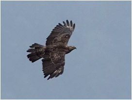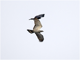 渡るタカとして次によく知られるのはハチクマです。サシバより大きなタカで,トビと同じくらいのサイズです。サシバと同じく北海道〜九州で繁殖し,インドネシアなどで越冬します。越冬先はサシバ同様に東南アジアですが,秋の渡りルートは大きく異なり,サシバは南西諸島の島々に沿って渡っていくのに対し,ハチクマは九州まで来るとそのまま西進,東シナ海を一気に横断して中国大陸に入り,そして大陸内を南下するルートとなります。サシバより大柄なタカであるとはいえ,中継できる島もほとんどない東シナ海をほぼノンストップで渡りきることには驚かされます。また,ハチクマは羽色のバリエーションが多いことでも知られており,下面が暗色からほぼ真っ白の個体まで,パターンの観察を楽しむこともできます。