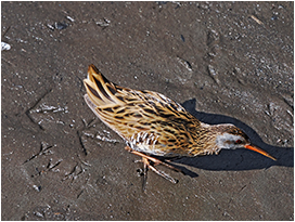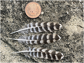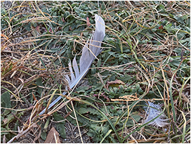 鳥ならではのフィールドサインであり,基本的に鳥は1年に1回,すべての羽を生え変わらせるため(換羽),見つける機会は比較的多いです。実際に手に取ってみると,多様な色と形,細かい構造などに魅了され,拾った羽をコレクションする人もよくいます。落ちている状況としては,水辺で岸に流れ着いていたり,公園などで落ち葉がたまっているところに紛れていたり,多くの鳥が集まるねぐらで見つかるパターンがあります。ほかに珍しいケースとしてタカなどの猛禽類がほかの鳥を捕食した痕跡,つまり食痕のフィールドサインから拾える場合もあります。