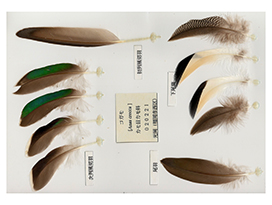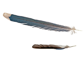 羽を拾ったら何の鳥が落としたかを調べたくなります。しかし多くの場合,それはあまり簡単ではありません。なぜなら1羽の鳥の中にも「初列風切」「大雨覆」「上尾筒」「尾羽」「体羽」など形や色の異なるさまざまな羽が生えており,まずはどの部位の羽かを見分けることが必要になります。さらに,全身の色のイメージと羽の色のイメージが一致しないことがよくあります。例えばキビタキは美しい黄色の姿が印象的な鳥ですが,よく見ると黄色なのは腹部や腰といった部分で,仮に翼の羽を拾ったとしても黄色いところはありません。こうした難しさから,羽を識別する専門の資料もいくつかありますので,そういったものを活用するのもよいでしょう。もちろんオナガの長い水色の尾羽のような,落とし主もその部位もすぐわかる羽もあるので,最初のうちは特徴的な羽を選んで拾ってみることが楽しむ第一歩です。