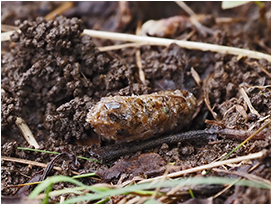 ペリットはカワセミ類やタカ類など一部の鳥しか残さないフィールドサインで,これは骨や毛といった消化できないものをかたまりにして吐き出したものです。落ちている場所やサイズから落とし主を絞り込むことができますが,ペリット自体が非常にもろいので,見つけてもすぐには手に取らず,まずはじっくり観察することがおすすめです。ペリットの中に含まれる昆虫の殻や魚のうろこ,動物の骨などから食べているものを見分けることができれば,その鳥の食性についての情報を得ることができます。